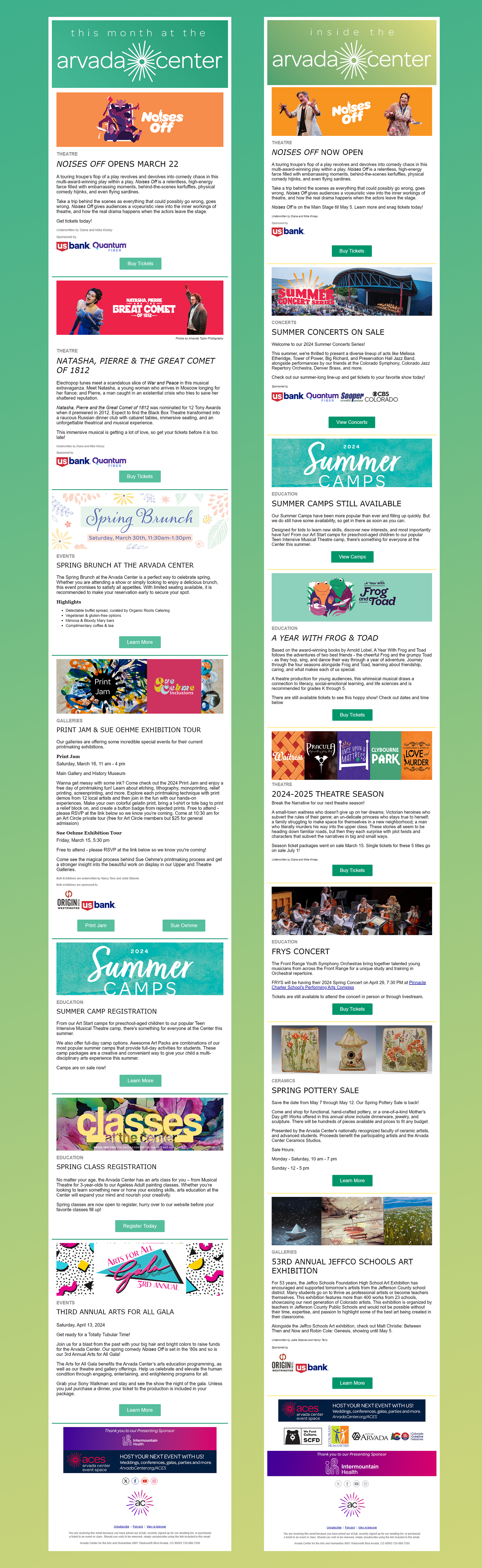 These are a couple of examples of newsletters I designed for the Arvada Center. I would match the month's midmonth newsletter and would change the color throughout the year to keep it visually engaging. These were sent to 62k-80k readers every month.